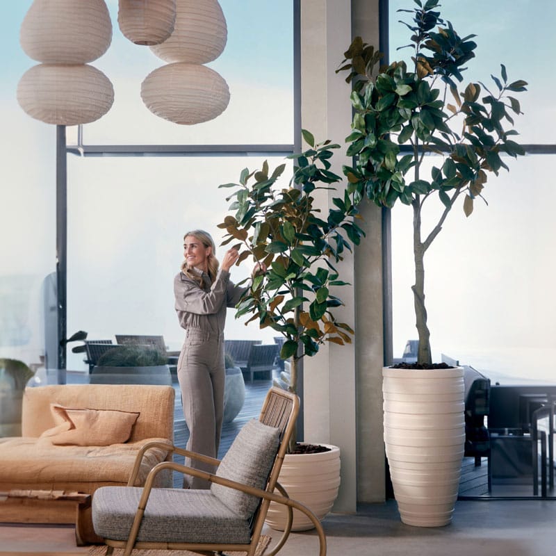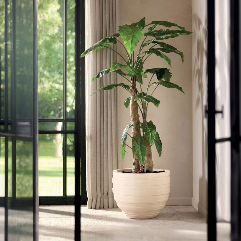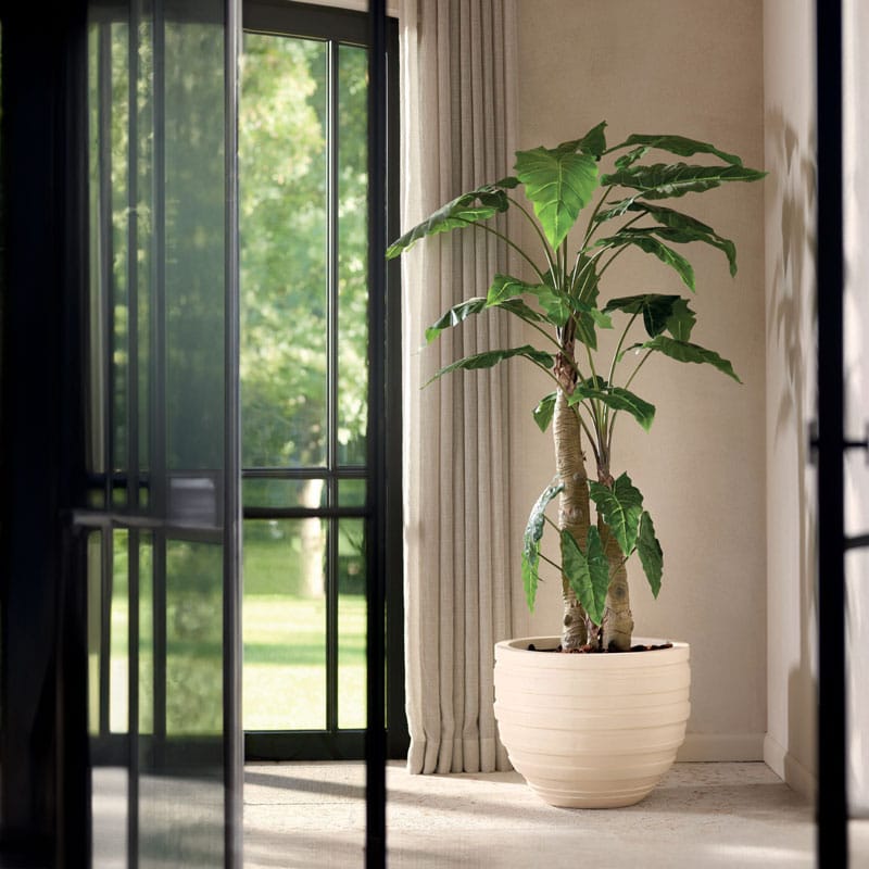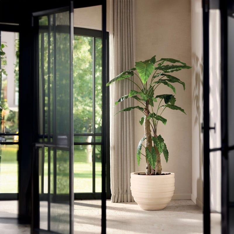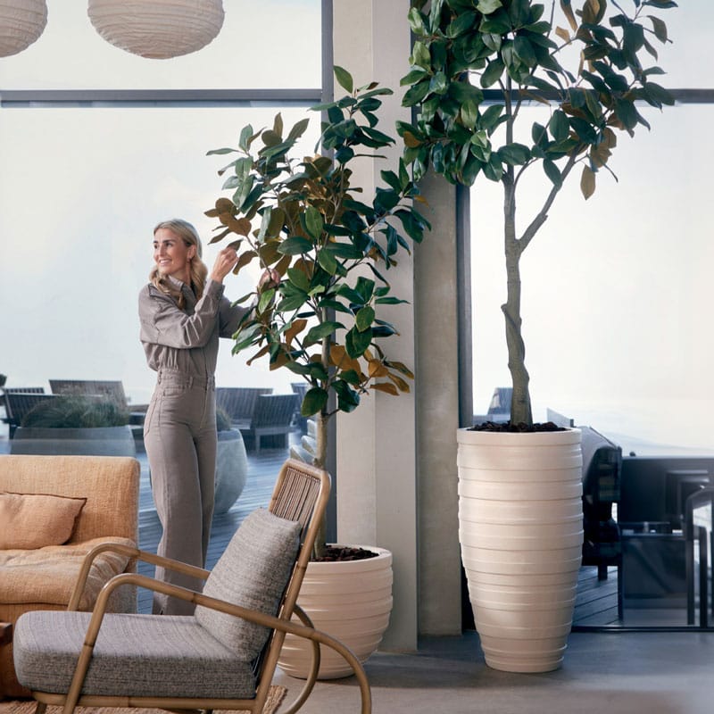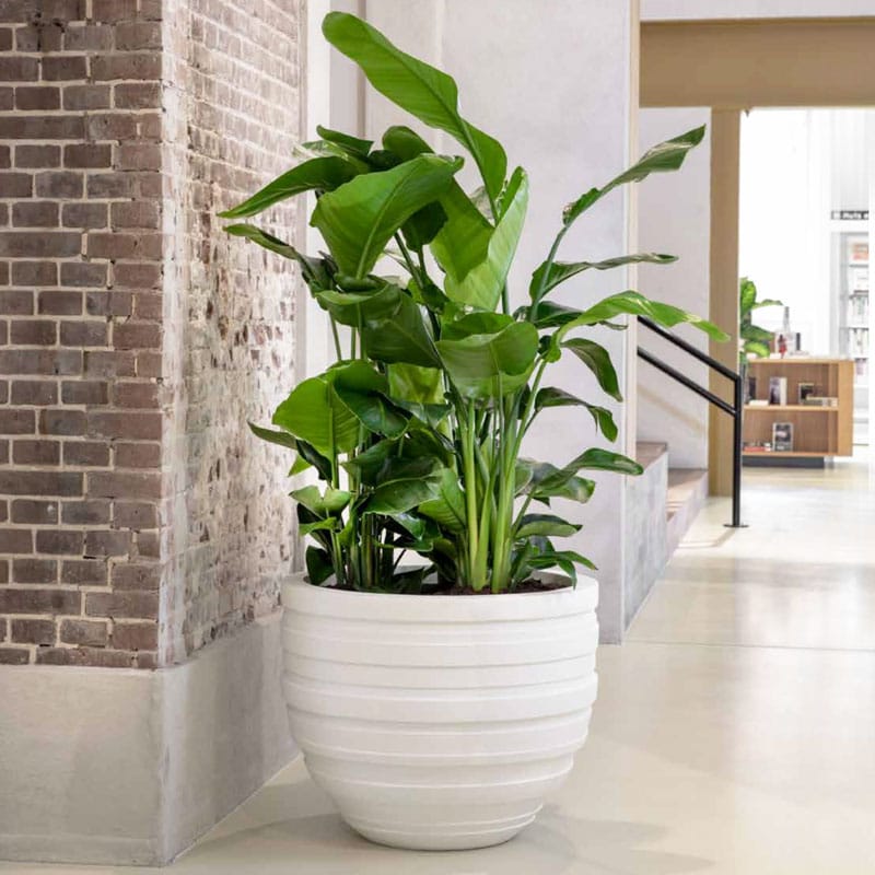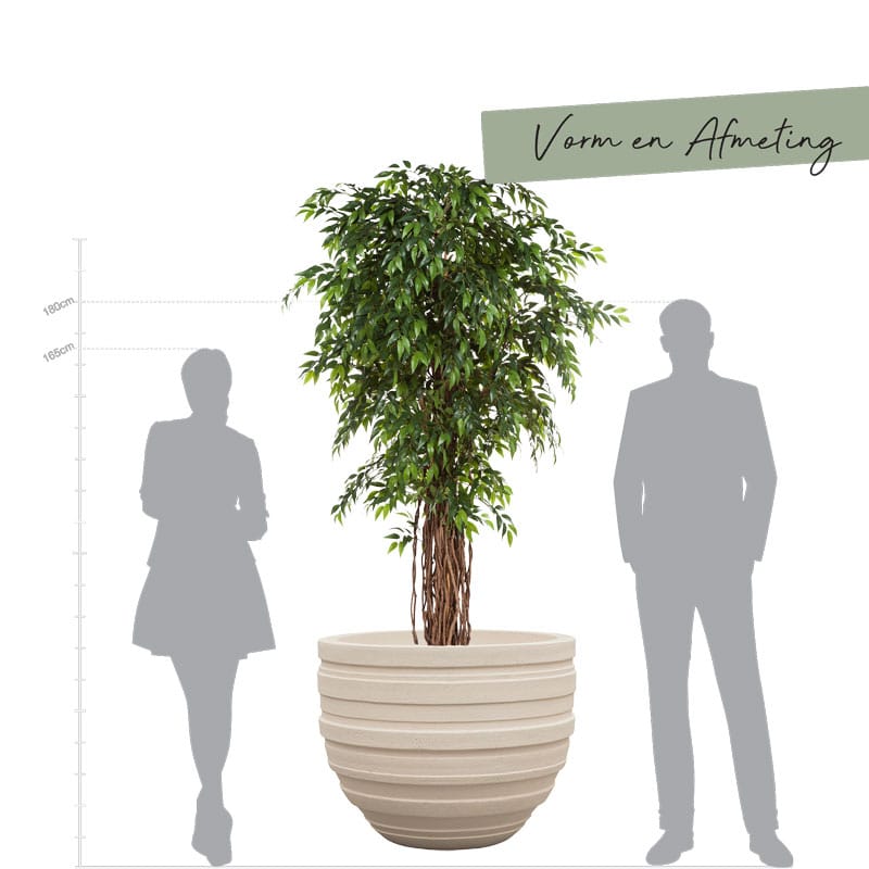 Grote brede XL plantenbak in strak en helder wit met bijzonder diepte streepreliëf. Van hoogwaardig kunststofsteen dus lichter van gewicht dan steen maar oersterk en makkelijk in onderhoud. Geschikt voor buiten maar ook prachtig binnenshuis. Afmeting: 70 x 70 x 56 cm Opening: 61 cm Diepte: 53 cm Kleur: Kalksteen warm wit Aantal: 1 stuk…