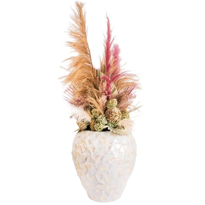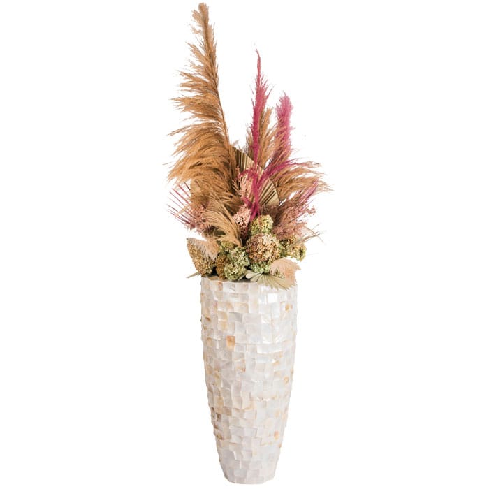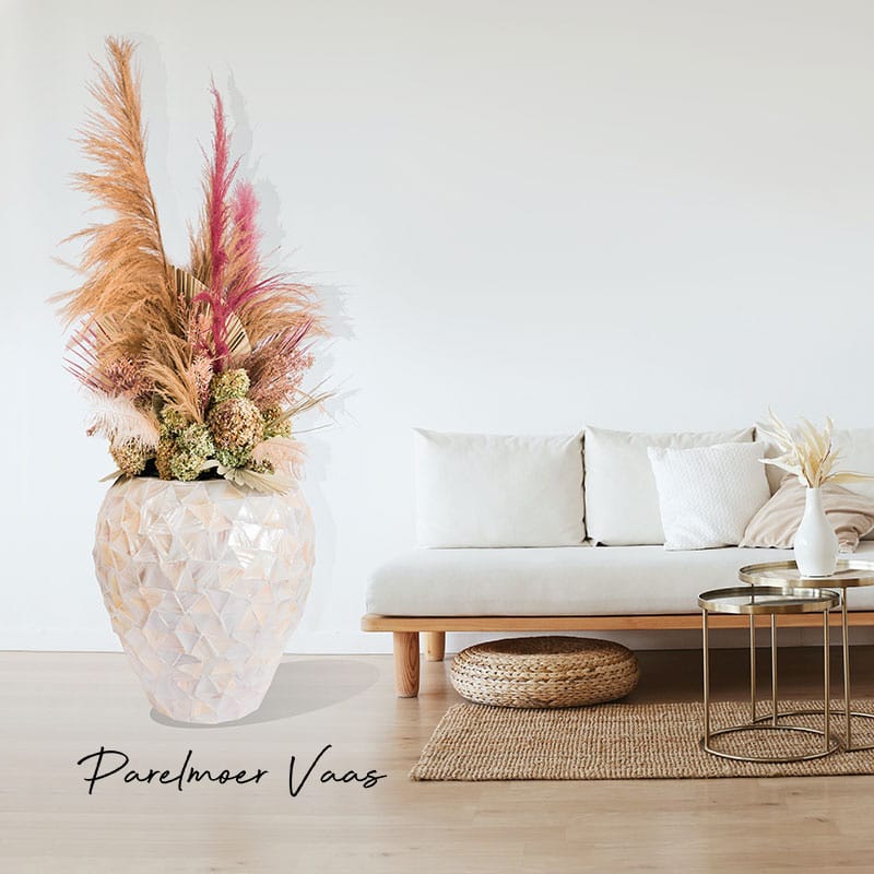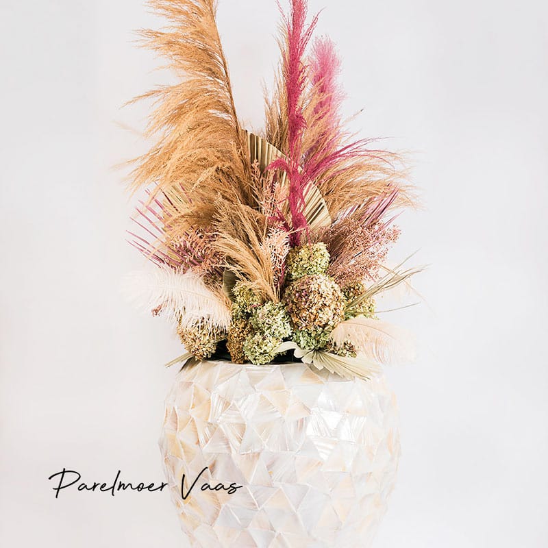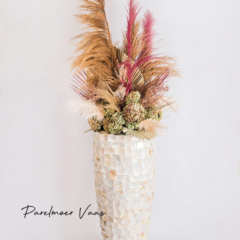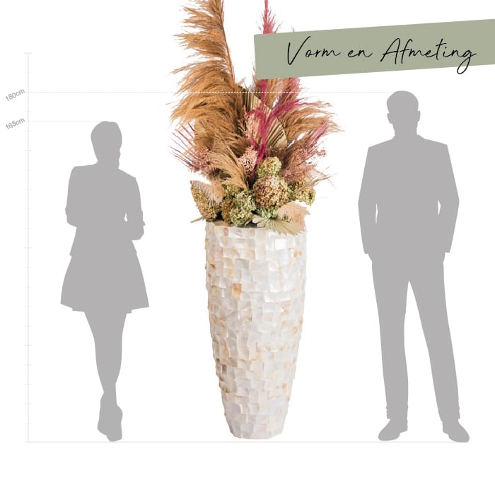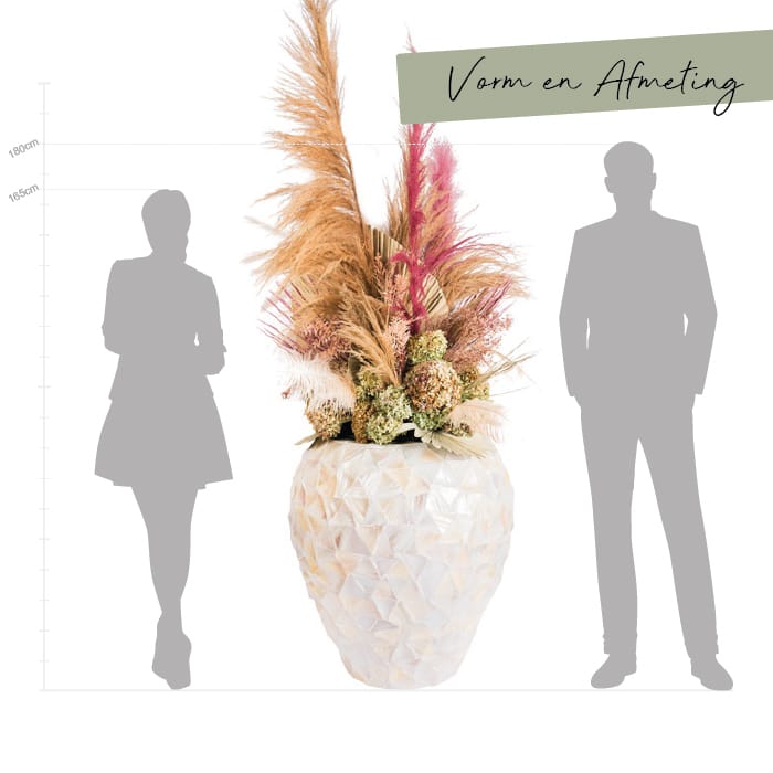 Een prachtig droogbloemenarrangement speciaal voor jou met de hand opgestoken in een luxe hoge vaas. Een heerlijk weelderige mix van hoge kwaliteit zijde en droogbloemen om heel erg lang van te genieten. Op zoek naar dit arrangement maar in een andere kleur, neem gerust contact op. Maat op de foto: Maat L Aantal: 1 arrangement…