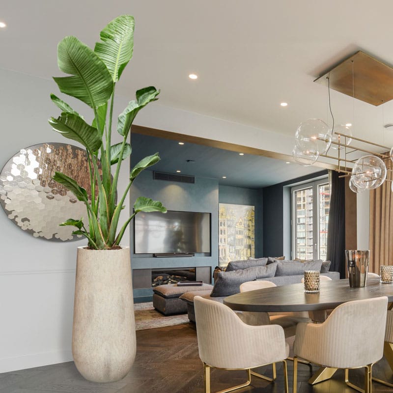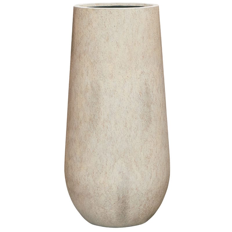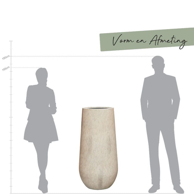 Prachtige hoge design vaas voor buiten met zachte vorm. En extra bijzonder; deze vaas heeft een authentiek travertijn-kalksteenlook maar is van hoogwaardig en sterk ficonstone. Dat maakt het mogelijk om door weer en wind van de aardse uitstraling van kalksteen te genieten. Een uniek element voor in de tuin of op het terras. Afmeting: 50…