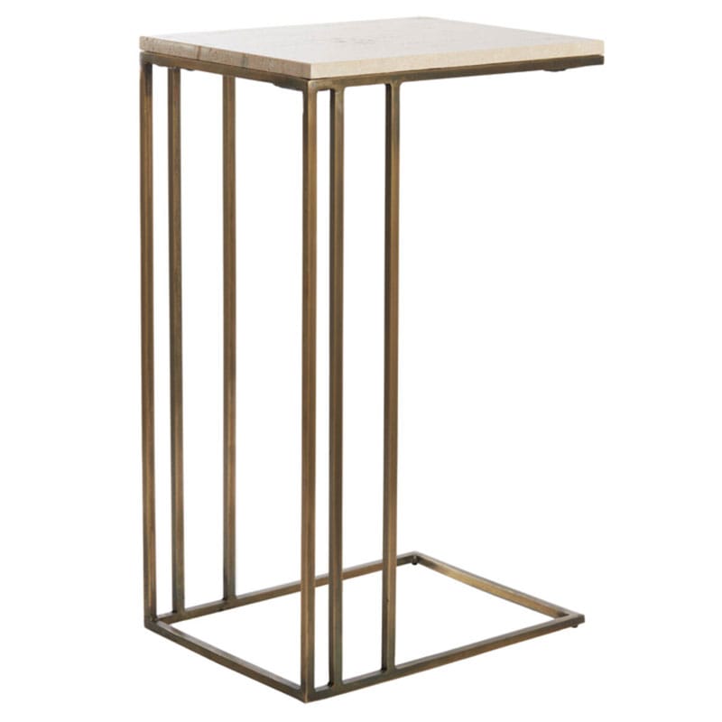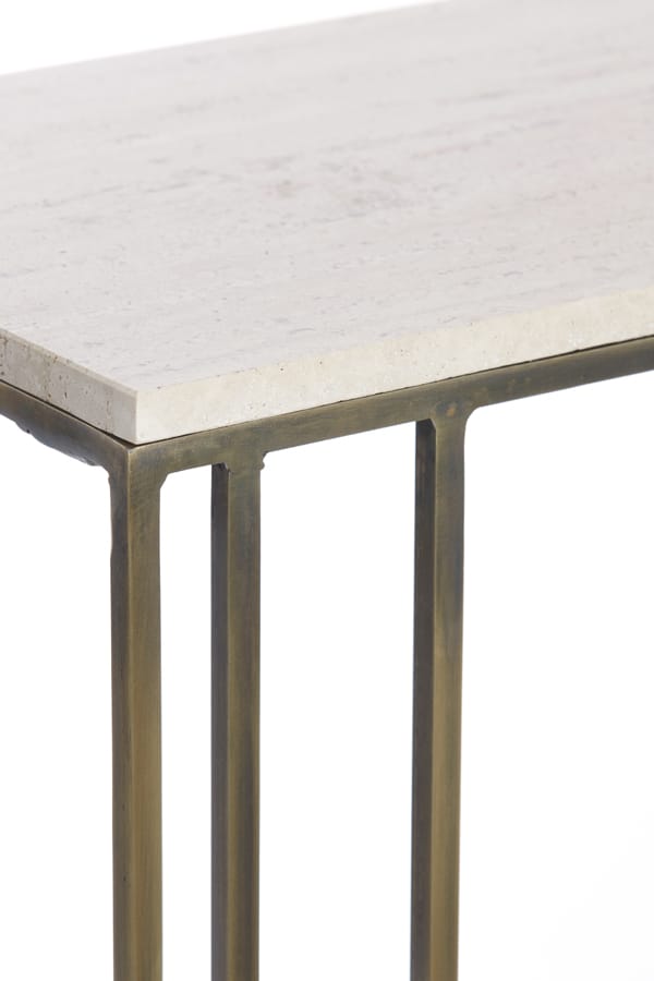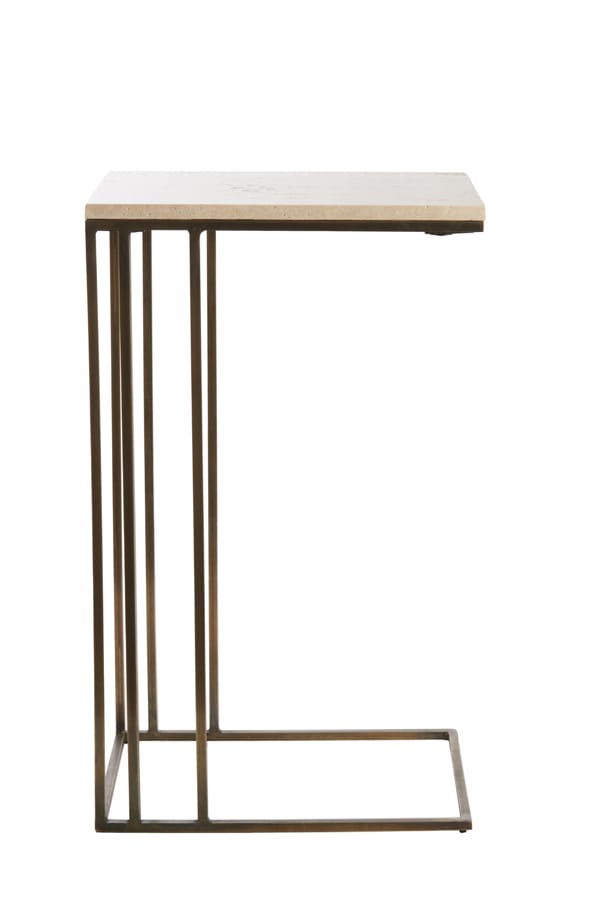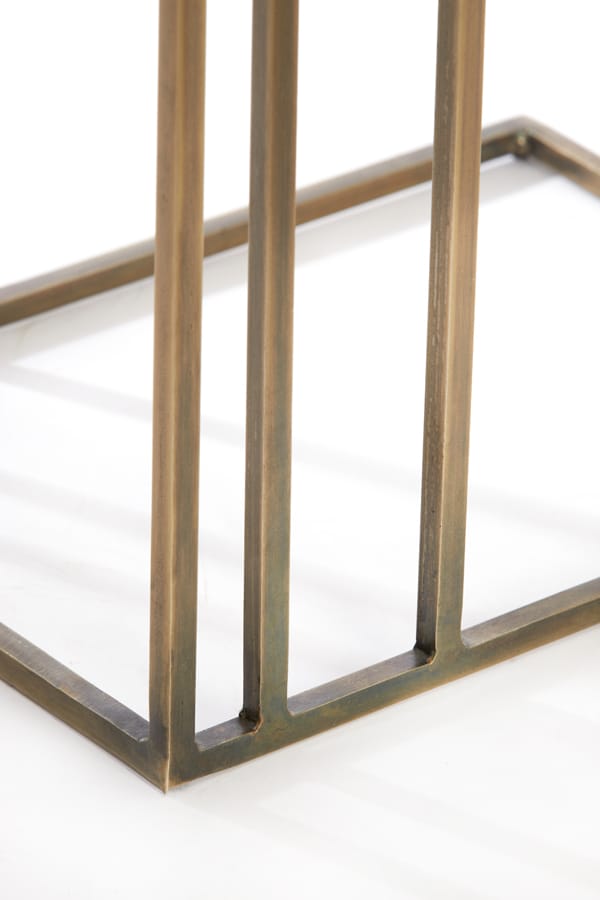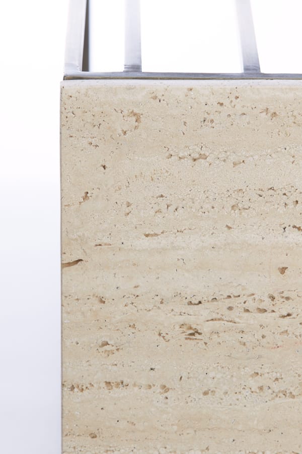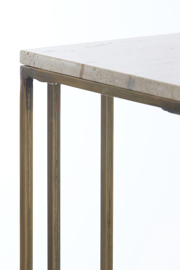 Luxe design plantentafel met een metalen onderstel in antiek brons kleur en een tafelblad van travertin in zandsteen kleur. Met dubbele asymmetrisch aangebrachte pootjes voor een visueel stijlvol effect. Het ontwerp is verfijnd en open met een strak moderne look. Geef je bloempotten de zichtbare en stralende plek die ze verdienen. Afmetingen: 41 x 31…