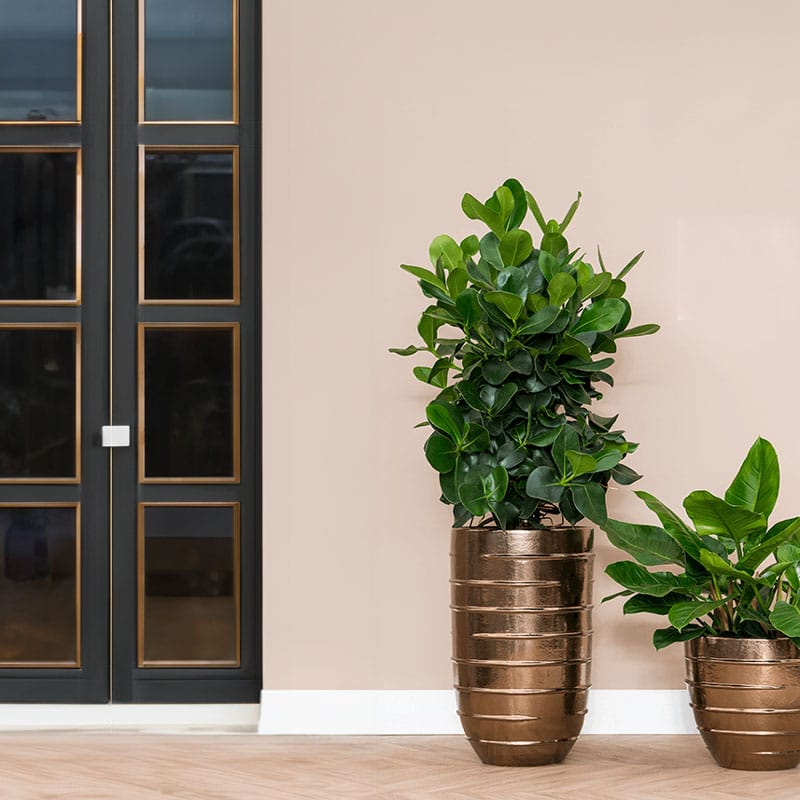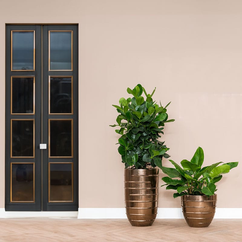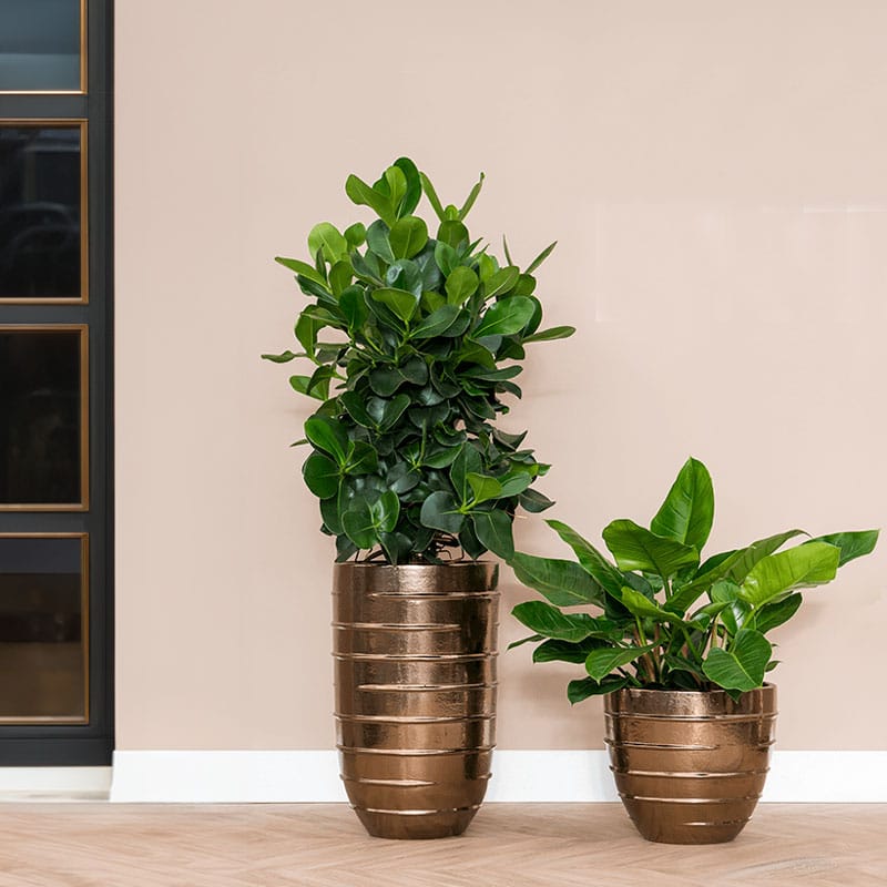 Grote bloempot met speels streeppatroon en luxe laag glazuur in onweerstaanbaar mat goud. Handgemaakt en een opvallend statement in je huis of tuin. Afmeting: 56 x 56 x 50 cm Opening: 51 cm Diepte: 45 cm Kleur: Goud Aantal: 1 stuk Artikelnummer: 2613 Gebruik: outdoor, voor gebruik indoor kunt u een binnenvaas bijbestellen via deze…