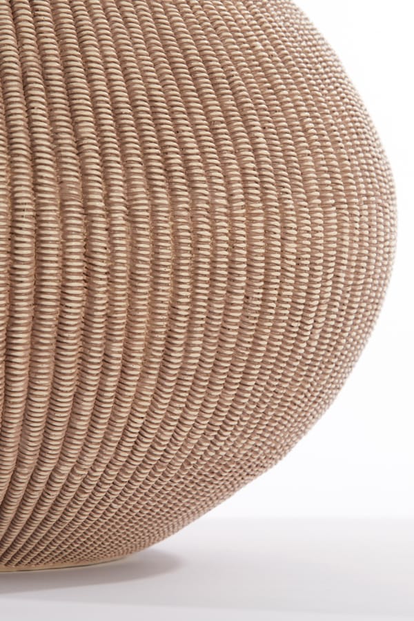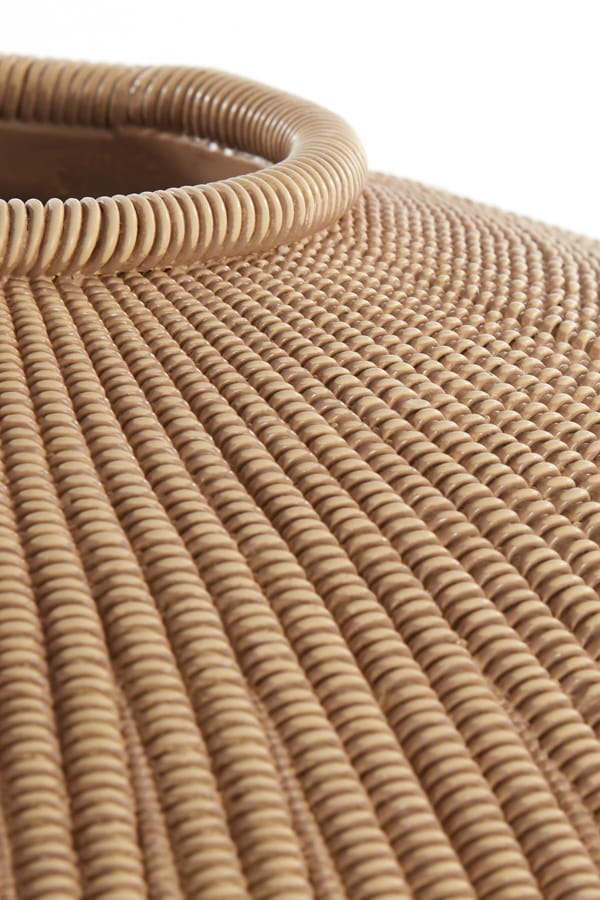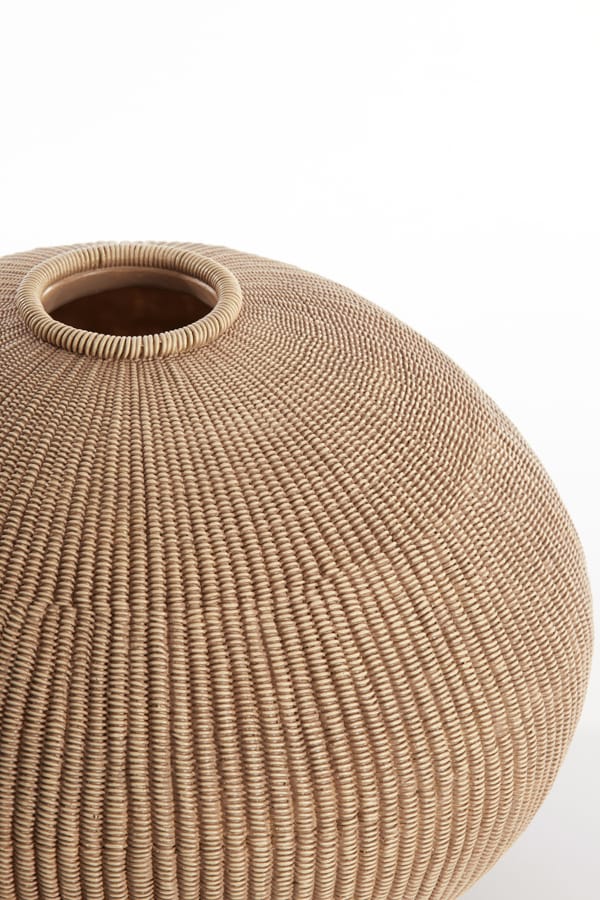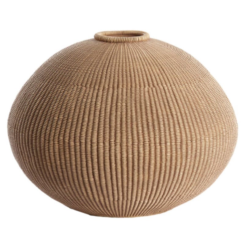 Luxe en decoratieve vaas met heerlijk bol ronde vormgeving en de rustieke uitstraling van gevlochten riet in een natuurlijke licht bruine tint. Afmetingen: 35 x 35 x 27 cm Diepte: 26 cm Kleur: Licht bruin Aantal: 1 stuk Artikelnummer: 5861282 Gebruik: Indoor, niet waterdicht Bijna al onze potterie handgemaakt en daarom uniek in patroon, kleuring…