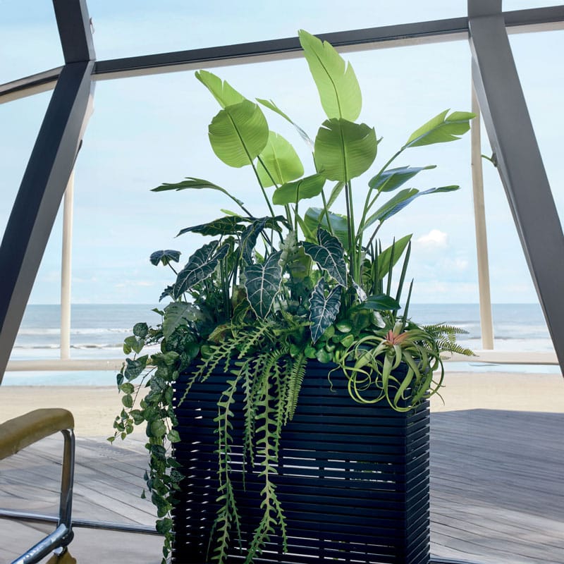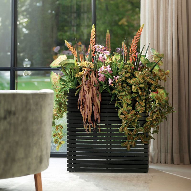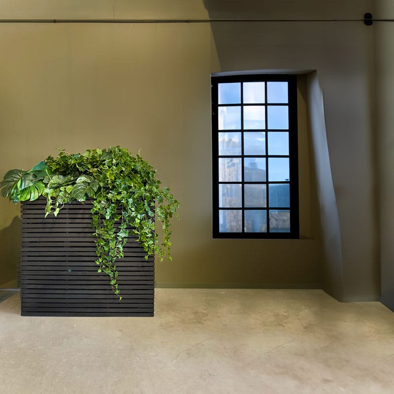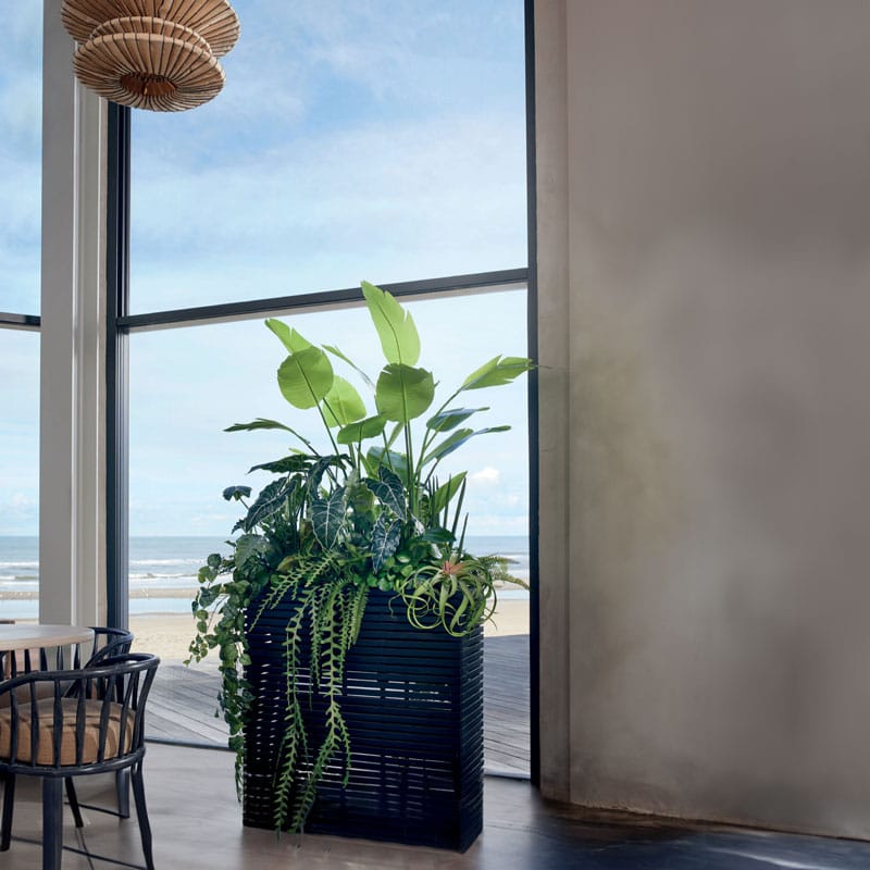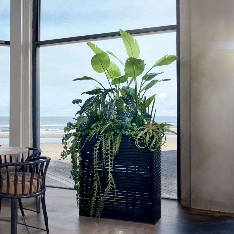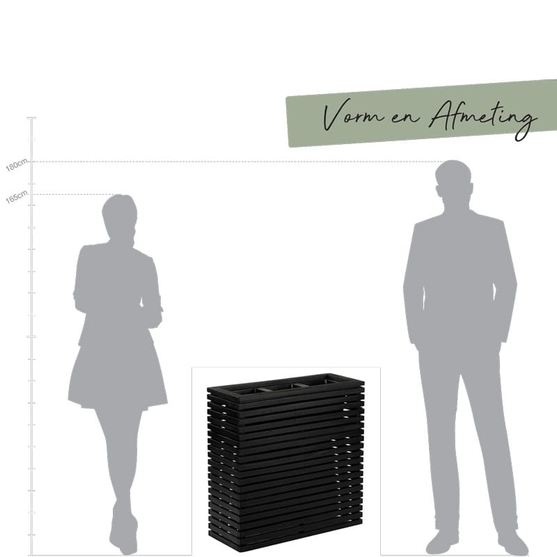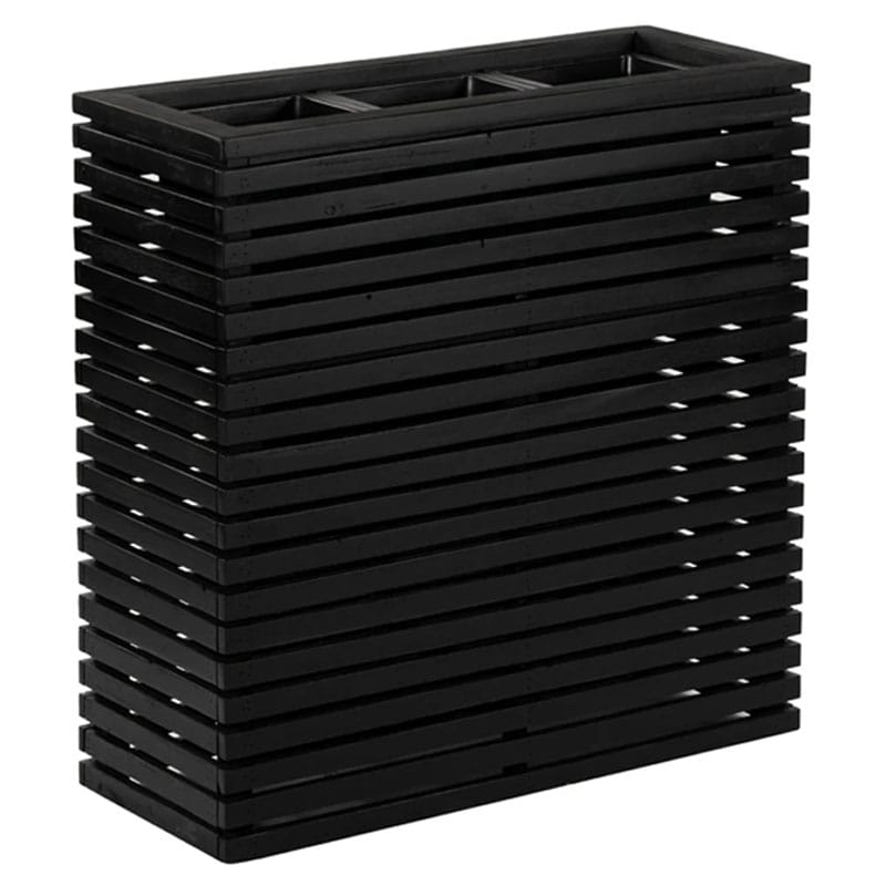 Hoge langwerpige plantenbak design divider in diep zwart en opgebouwd uit latjes wat een open structuur geeft. Licht in gewicht maar van hoogwaardige kwaliteit en zowel binnen als buiten te gebruiken. Afmeting: 72 x 30 x 76 cm Opening: 18 cm Diepte: 18 cm (door uitneembare binnenvaas) Kleur: Zwart Aantal: 1 stuk Artikelnummer: 2608 Gebruik: outdoor,…
