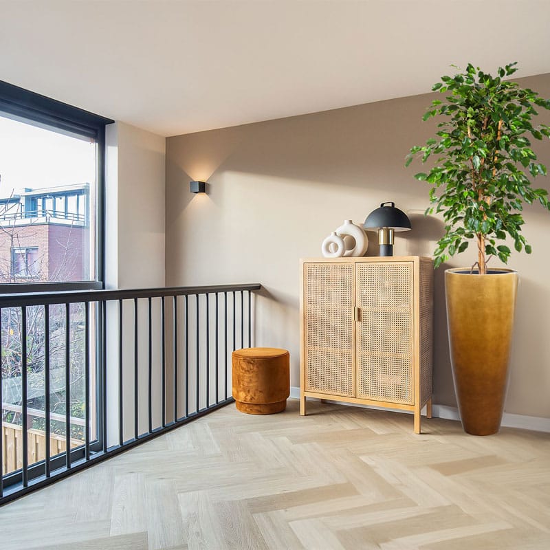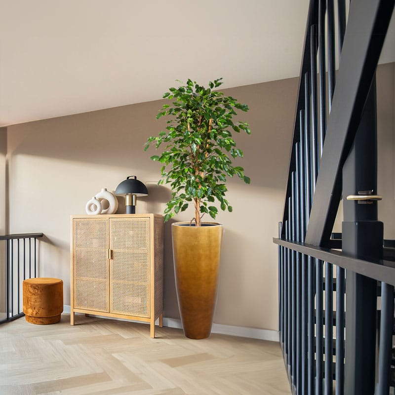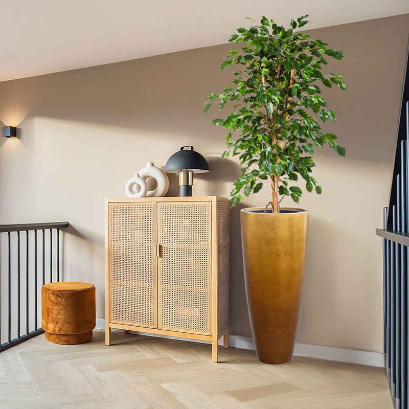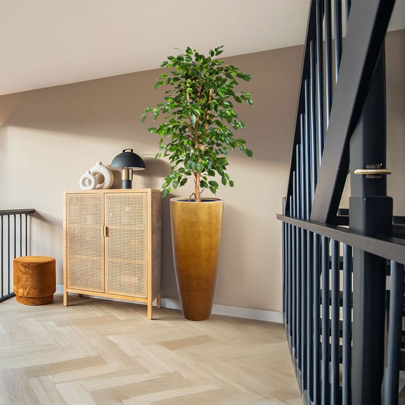 Prachtige luxe en heerlijk hoge vaas in een mat glanzende honing gouden kleur met capiz pearl reliĆ«f dat het licht prachtig vangt. Afmeting: 40 x 40 x 90 cm Opening: 36 cm Diepte: 30 cm (door uitneembare binnenvaas) Kleur: Honing goud Aantal: 1 stuk Artikelnummer: 2019 Gebruik: Indoor, inclusief ingebouwde uitneembare 100% waterdichte binnenvaas. Bijna…