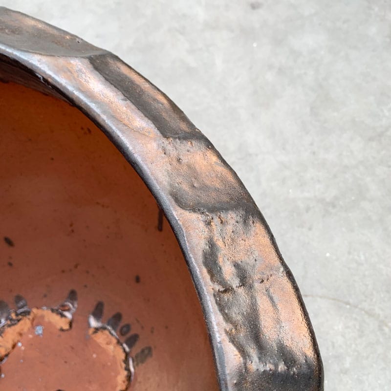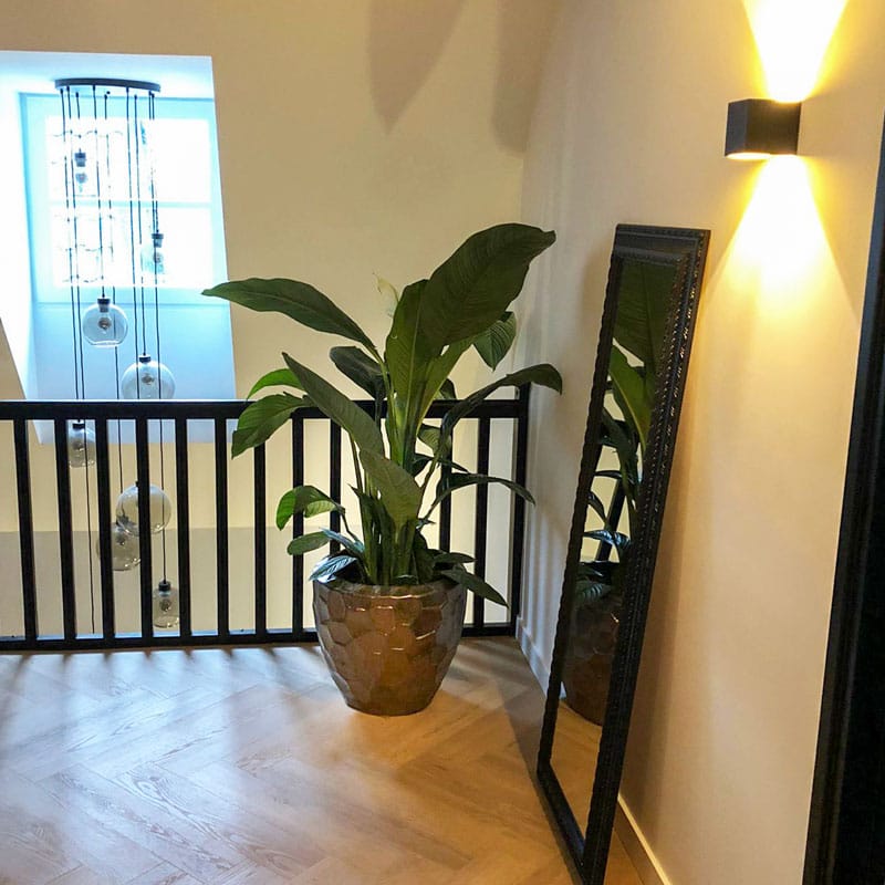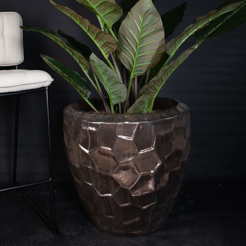 Hoge robuuste bloempot in stoer verweerd brons-goudkleur van handgemaakt keramiek. Met subtiel en opliggend grillig honingraadpatroon. De lichtinval laat een gouden shimmer zien, in het donker een diep donker brons. Afmeting: 50 x 50 x 50 cm Opening: 45 cm Diepte: 48 cm Kleur: Brons goud Aantal: 1 stuk Artikelnummer: 2596 Gebruik: outdoor, voor gebruik…