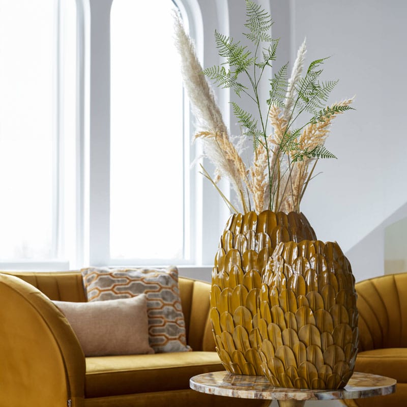 PLUMA hoge okergele vaas met 3D veren reliëf 50cm