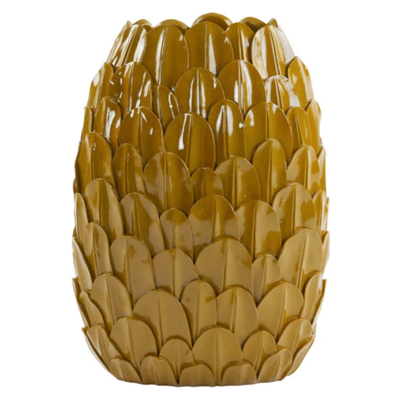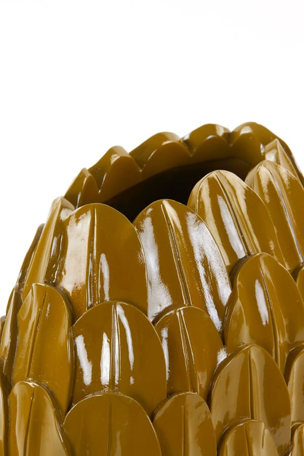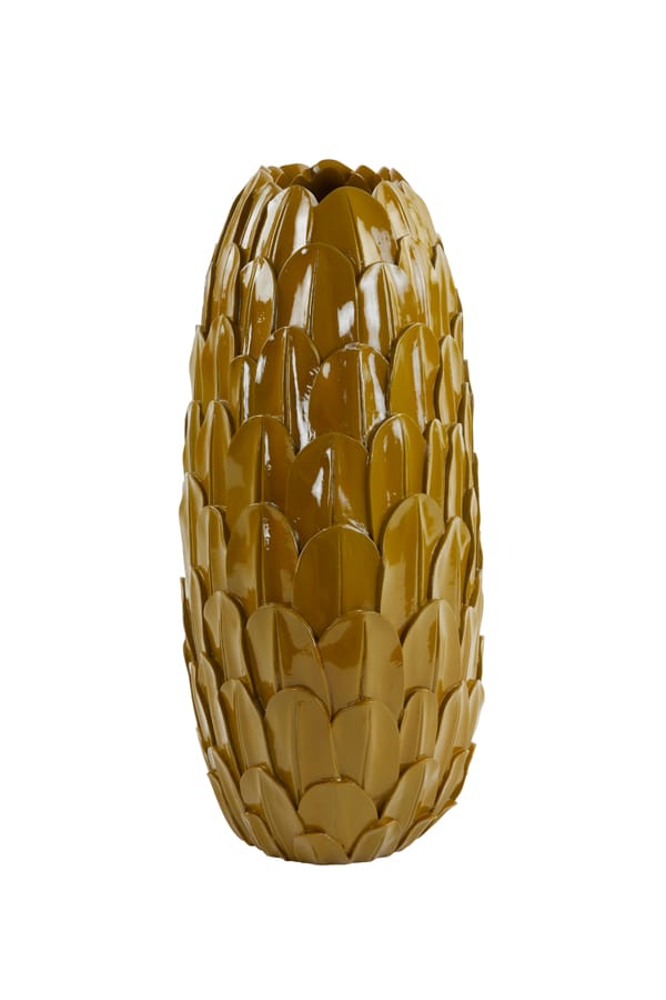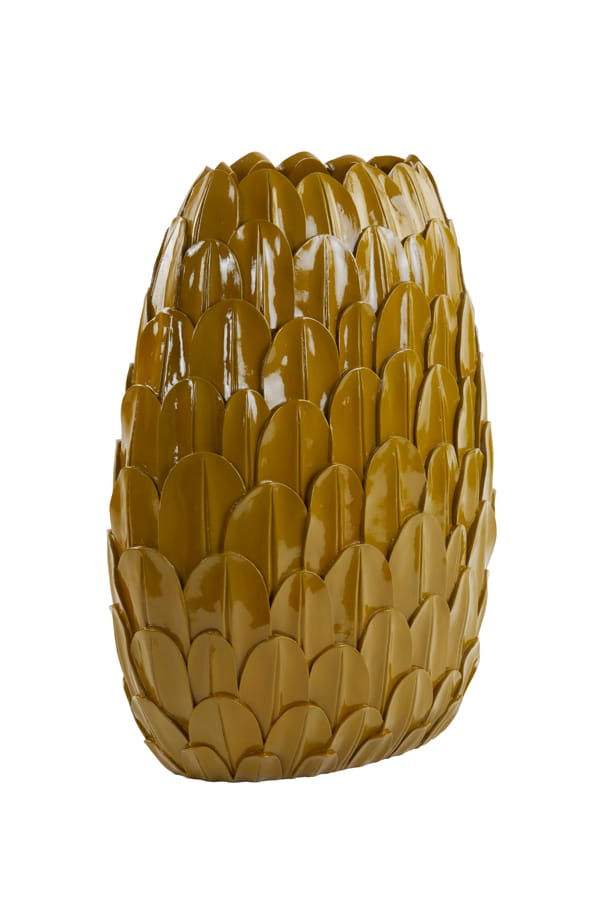 Bijzondere decoratieve vaas met een smal ronde vormgeving en een geschubd design. Met een stijlvolle, opvallende en warme uitstraling in okergeel staat deze schoonheid prachtig in je interieur. Door de vorm ook zeker geschikt op een smallere plek zoals een vensterbank of schouw. Afmetingen: 50 x 37 x 23  cm Kleur: Okergeel Aantal: 1 stuk…