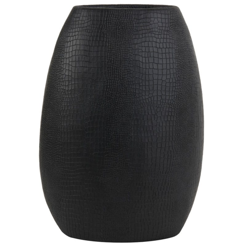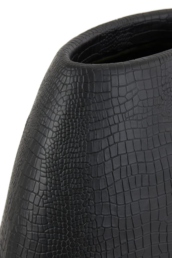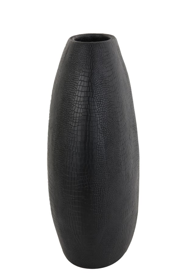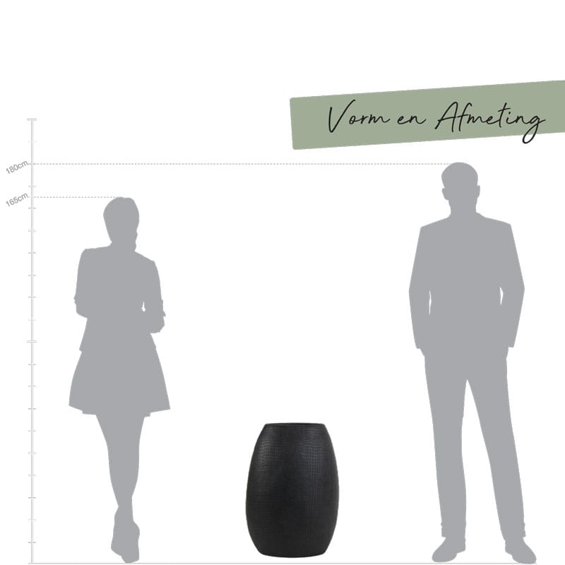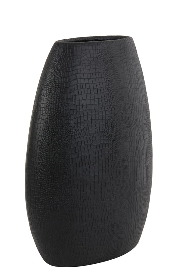 Hoge vaas in mat zwart met een stoere snakeskin patroon. Door de ovale vorm past hij ook heel goed op een smallere plank in een open kast, op een schouw of in de vensterbank. Een stijlvol pareltje voor in je interieur. Afmetingen: 35 x 20 x 50 cm Kleur: Zwart Aantal: 1 stuk Artikelnummer: 5845012…