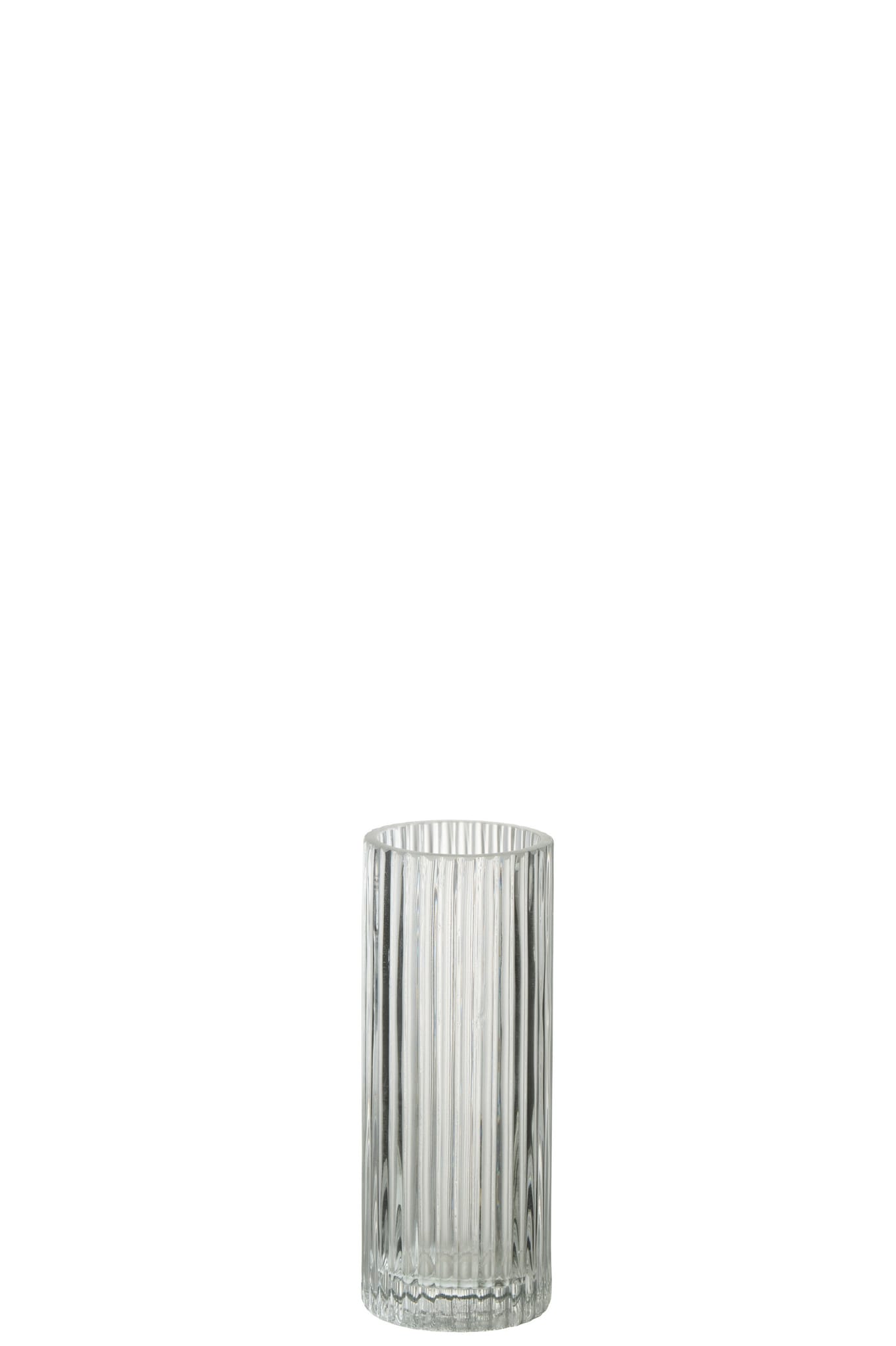 Prachtige smalle bloemenvaas van transparant glas met een verticaal streeppatroon. De cilinder vormgeving maakt het een ingetogen schoonheid voor op een mooi plekje in je huis. Heerlijk om te vullen met een paar mooie bloemen of siertakken. Ook heel geschikt om speels te combineren met andere vazen voor een leuk setje. Afmetingen: 8 x 8…
