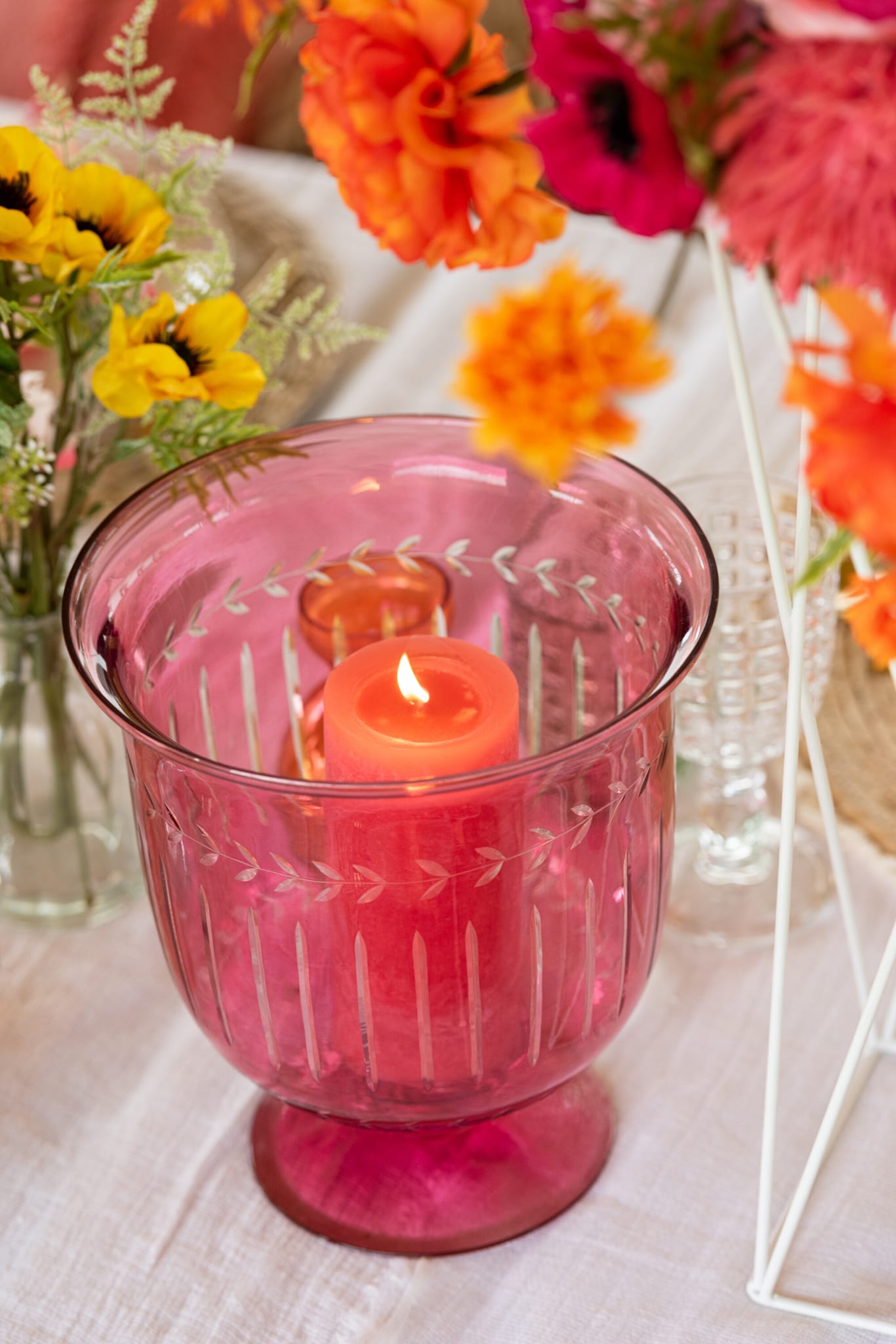 Prachtige en opvallend gekleurde glazen vaas op een stijlvol voetje. De vaas is qua vorm en gravure-dessin speels geïnspireerd op de Romeinse stijl. Een pareltje voor op een fijn plekje in je huis. Mooi als los object, maar ook heel leuk  te combineren met de andere vazen tot een mooi setje. Heerlijk om te vullen…